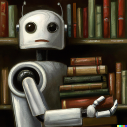 Faça uma pintura a óleo de um robô gerenciando uma biblioteca de livros.