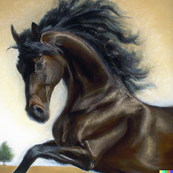 Uma pintura a óleo de um garanhão marrom escuro no meio do salto com sua crina sendo soprada pelo vento