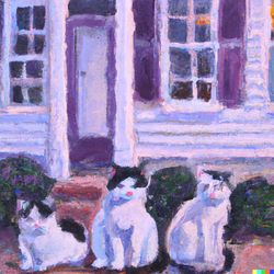 uma pintura a óleo de três gatos sentados em frente a uma casa branca com janelas roxas cedo de manhã