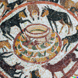 Um mosaico de animais em um simpósio romano bebendo vinho durante um banquete
