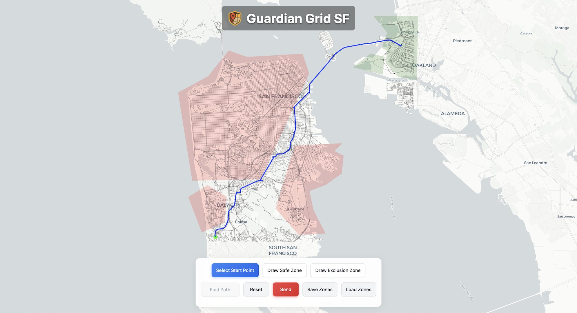 Guardian Grid (SF) is a smart city emergency evacuation tool that helps communities respond quickly and safely during major disasters. The system allows city administrators or emergency officials to mark danger zones, such as areas affected by natural disasters, and define safe zones directly on an interactive map. Advanced path finding algorithms are then used to generate and communicate the safest evacuation routes for residents, taking current hazards into account.